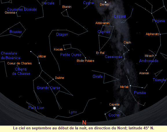 Au Nord, on remarquera que la Grande Ourse a fortement baissé vers l'horizon. Sa ligne générale est presque horizontale, désignant Arcturus qui ne va pas tarder à se coucher, entraînant à sa suite toute la constellation du Bouvier, le tout précédé des Chiens de Chasse et de la Chevelure de Bérénice, déjà noyés dans les brumes de l'horizon : et avec eux ces trois couples de petites étoiles qui sont comme les avancées de la Grande Ourse. Si, comme par le passé, nous prolongeons I'alignement de la Grande Ourse au delà d'Arcturus, nous n'y voyons plus I'Epi (Spica) : Il a disparu, ainsi que la Vierge : mais, si de la Grande Ourse nous redressons la tête en suivant la ligne des deux étoiles du front Alpha et Bêta, nous retrouvons l'immobile Polaire, centre de notre cadran, et nous constatons que la Petite Ourse, l'aiguille de notre horloge céleste, est, maintenant presque horizontale, devant, vers le temps de l'équinoxe d'automne, marquer les trois quarts de la grande heure annuelle.